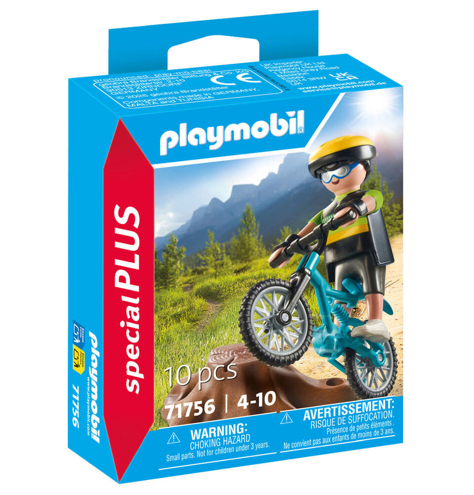 Set includes one figure, mountain bike, and other accessories. Recommended for ages four to ten years. Warning. Choking Hazard. Small parts. Not for children under 3 years.