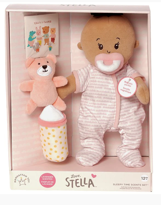 The doll's bottom is lightly weighted and designed to sit unassisted - perfect for playtime! Sleepy Time doll has embroidered features, fabric hair, a plump tummy, and a cute little belly button. The set includes a signature magnetic pacifier, a magnetic bottle, a teddy bear companion, and a mini paper bedtime picture book. Clothes are removable and feature hook-and-loop closures for supporting elementary dressing skills.