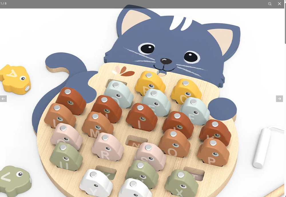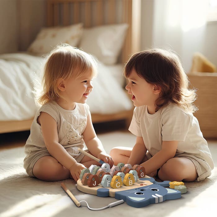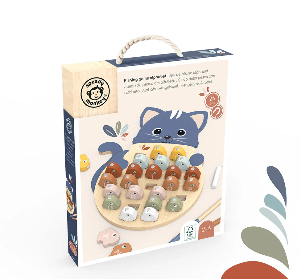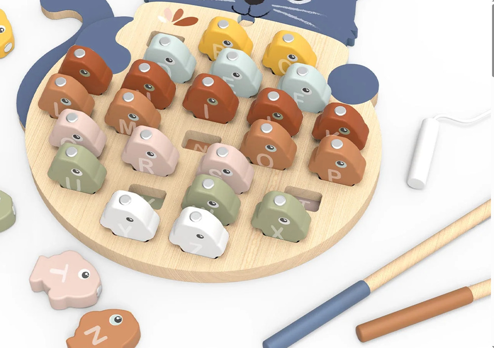 This colorful and educational toy is designed to help toddlers learn the alphabet while developing essential fine motor and coordination skills. With 26 lettered fish and 2 magnetic fishing rods, kids can take turns "catching" letters, making it a perfect activity for solo or cooperative play. Each wooden fish features a brightly painted letter of the alphabet, helping children become familiar with letter shapes and sequencing in a playful, hands-on way. The magnetic fishing rods are easy to grip, encouraging hand-eye coordination and concentration.