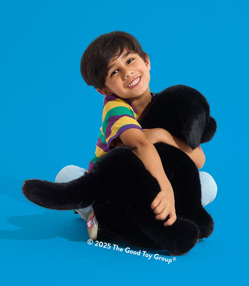 Made from high-quality and sturdy plush materials, Spruce’s deep black fur, soft floppy ears, and expressive eyes capture the essence of a loyal black dog.