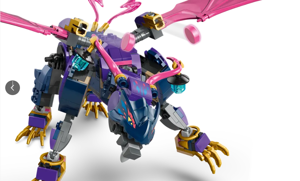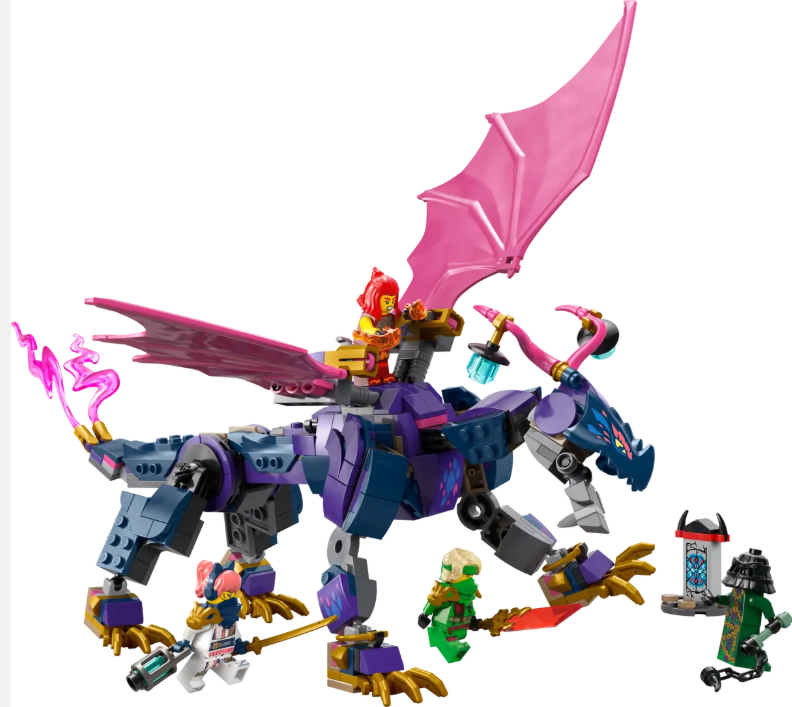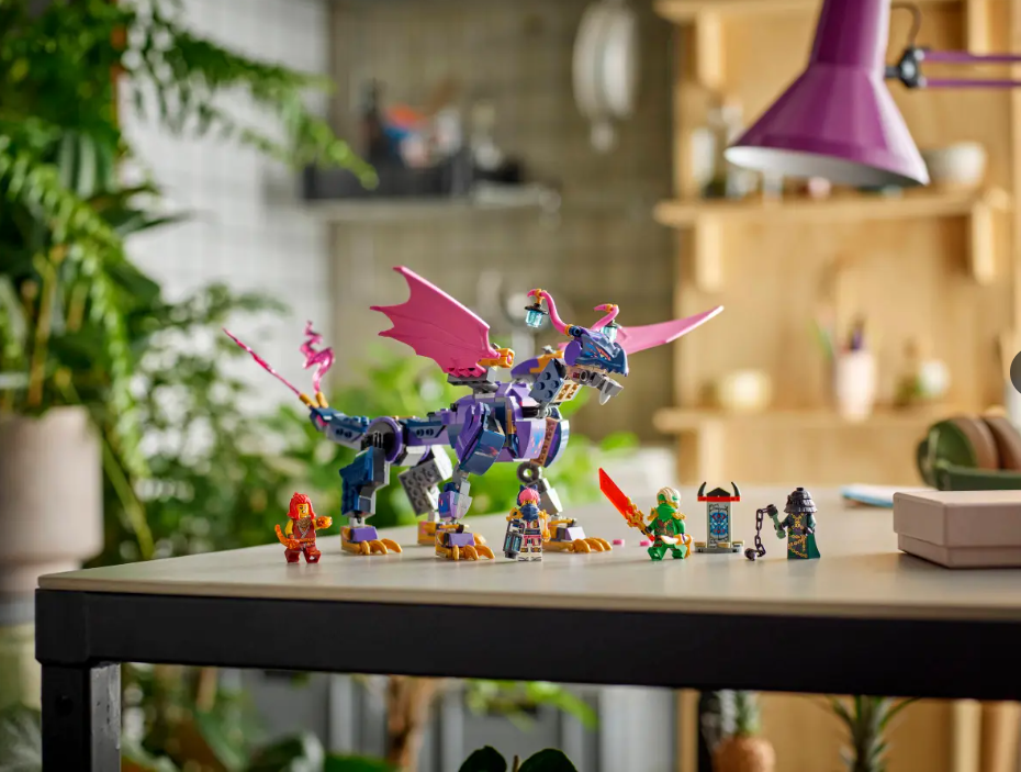 Highly posable dragon figure – This large dragon model features a posable tail, legs, wings, head and jaw, 2 positions on its back for a minifigure, plus a stud shooter under each wing