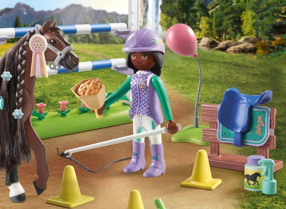 The idyllic Waterfall Ranch is at the heart of the detailed new horse world from PLAYMOBIL. There, the five best friends Amelia, Isabella, Zoe, Ellie and Ben spend every free minute together with their horses and experience exciting adventures. Zoe has ambitious goals: She wants to become the best show jumper in Waterfall and trains diligently every day with her beloved gelding Blaze. The two are a well-coordinated team and effortlessly take every obstacle on the riding course.