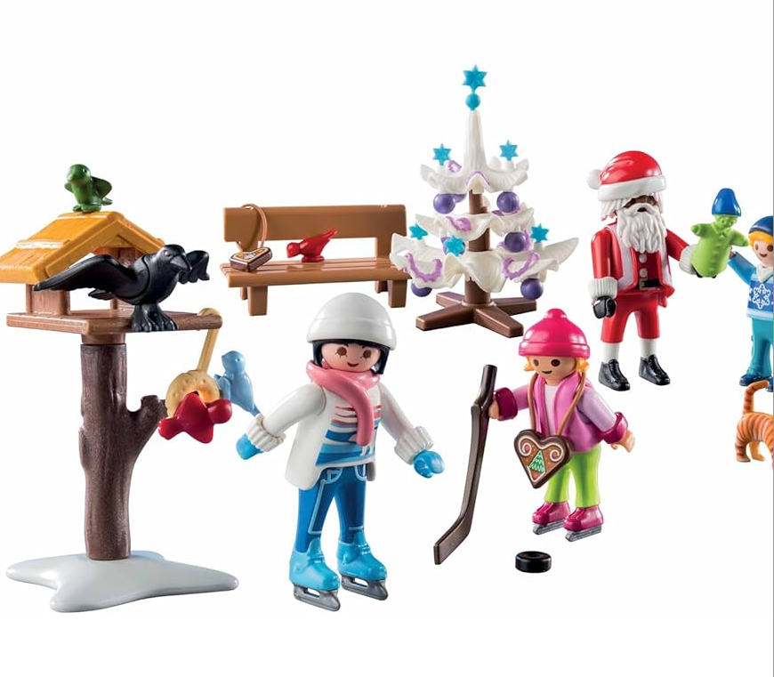 Figures: 1x Santa Claus on ice skates, 1x woman with hat on ice skates, 1x girl with hat on ice skates, 1x boy on ice skates Animals: 1x cat, 1x crow, 4x birds, 2x squirrels; Accessories: 1x jute sack with Christmas presents, 3x gingerbread, 4x hand lanterns, 3x food bags with treats, 1x bar table, 2x trays with 4x cups, 1x drinks bag, 1x Christmas tree, 1x ice hockey stick with puck, 1x bench, 1x elf doll, 1x wooden sledge, 1x standing birdhouse