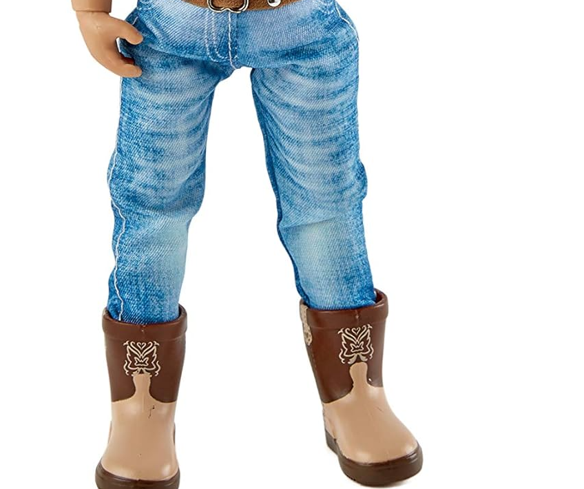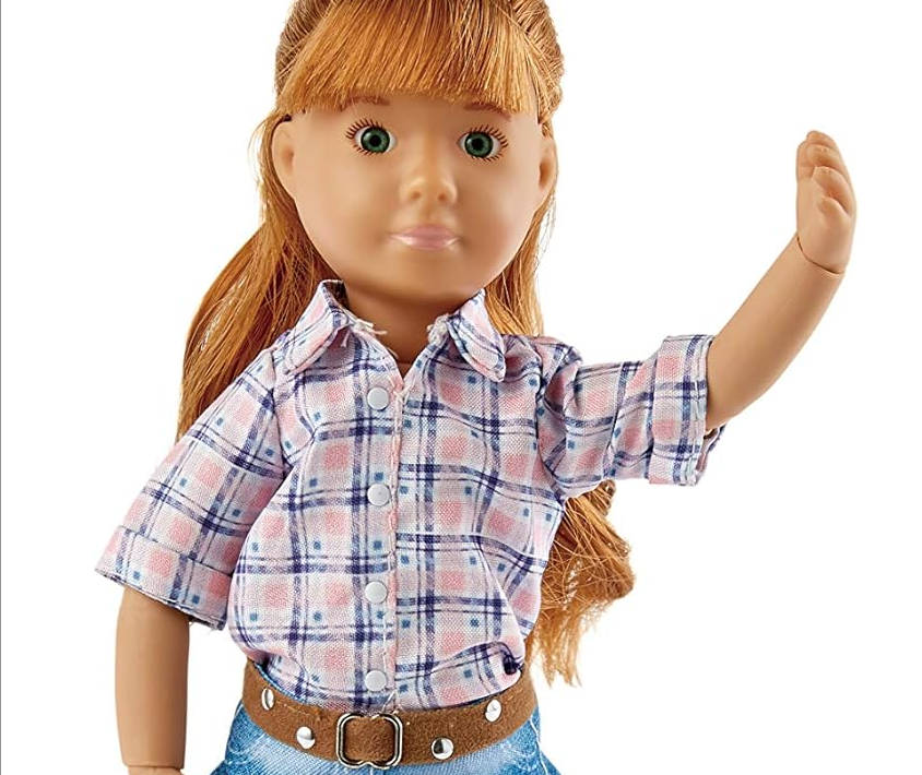 This the Kruselings doll Chloe wearing her favorite horseback riding outfit. Chloe wears a plaid shirt, jeans with a belt and riding boots.