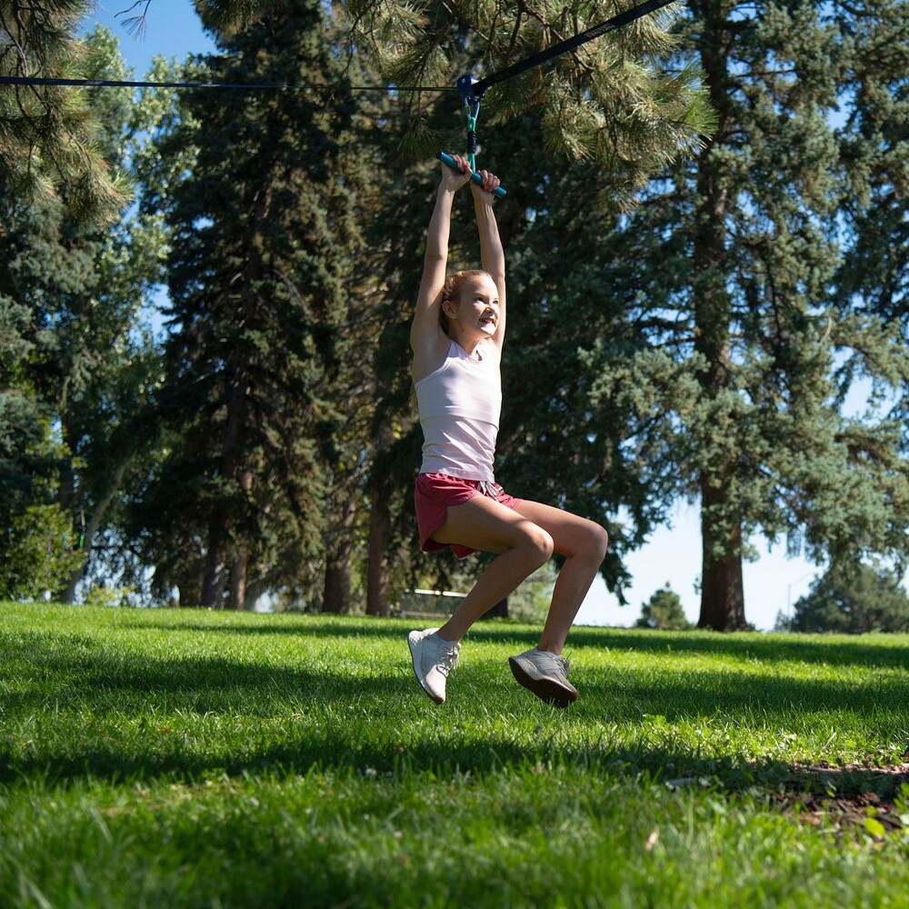 FUN, FUN, FUN! Kids don’t stop riding it with easy to grab and hold on for the short distance up to 30’ length. Once they stop, they pull the trolley back up to start tree and ride again, again. Perfect for riders 5 – 10 + years.