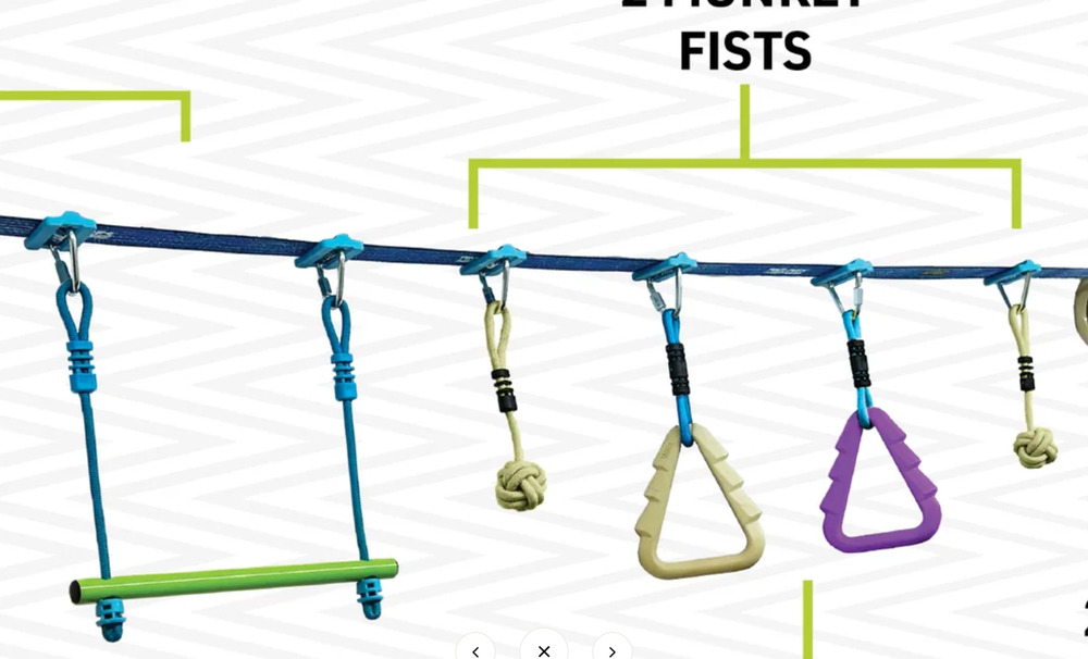 Kit contains: 36’ line and heavy duty Ratchet, 2 Monkey Bars, 2 new Tree Holds, 2 Monkey Fists,2 Gym Rings, Ratchet Cover, 8 Delta Carabiners & Line Clips that allow you to attach obstacles anywhere on line.