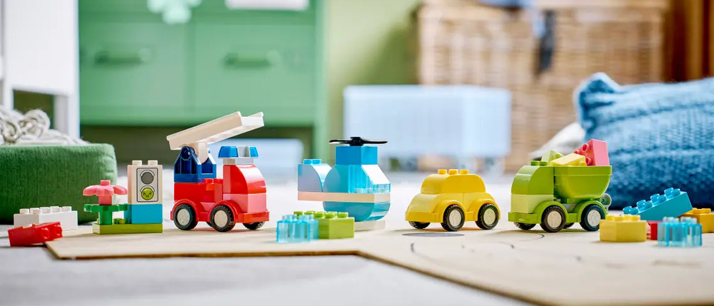 EVERYDAY VEHICLES – Toddler building kit’s main models include a small car toy, a LEGO® DUPLO® helicopter with a spinning rotor, a dump truck with a tipping bed and a fire truck toy with a ladder and more