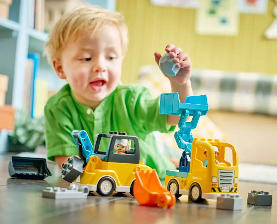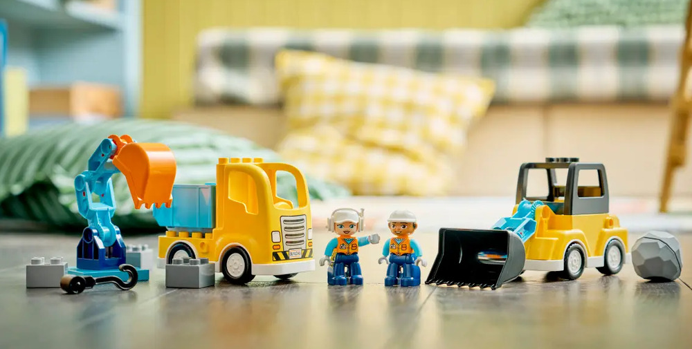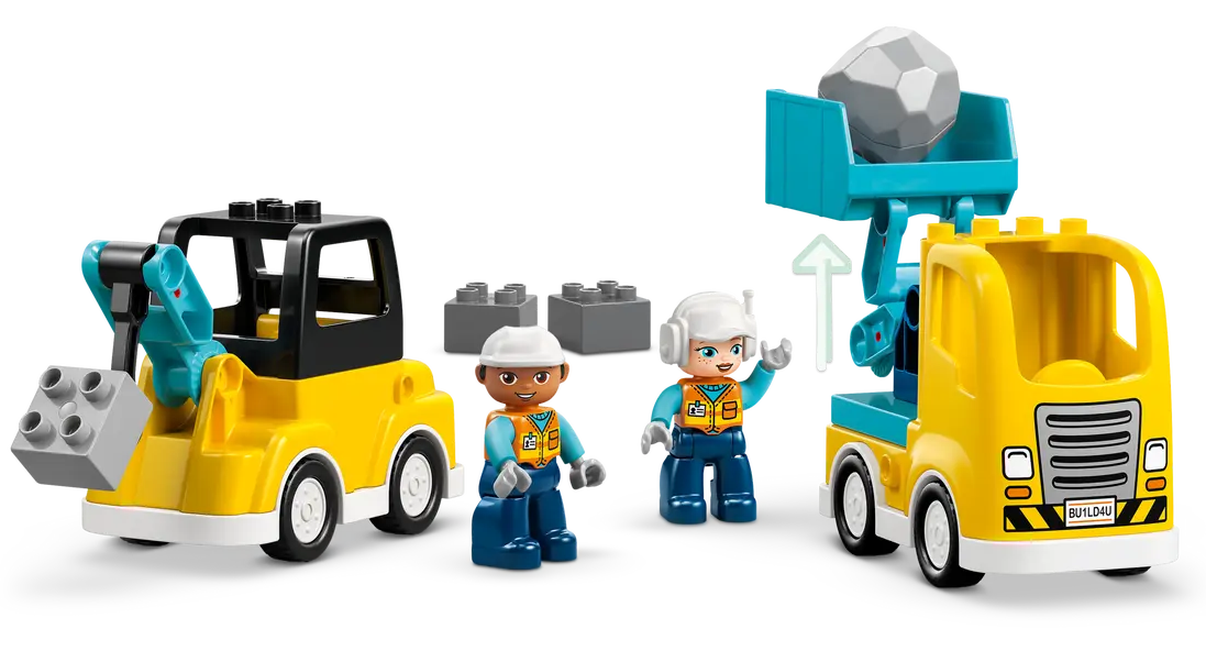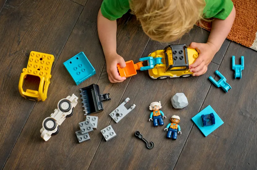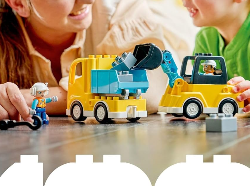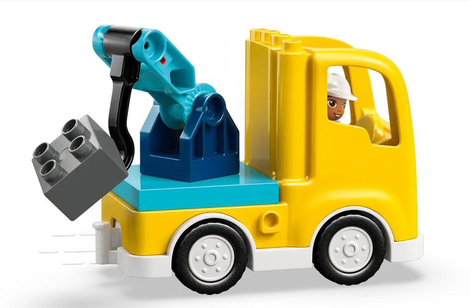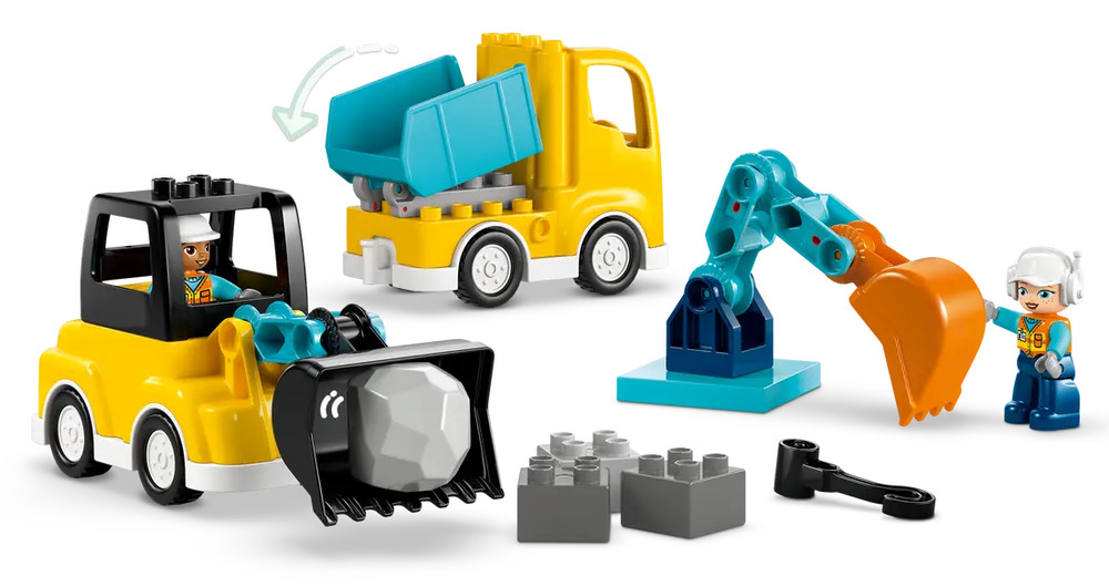 1 SET, 6 VEHICLE TOYS – This toddler LEGO® DUPLO® set’s bricks assemble to make 2 tow trucks with different hooks, a loader, scissor lift, dump truck or excavator toy with a flexible arm