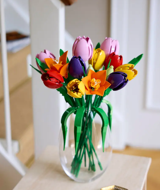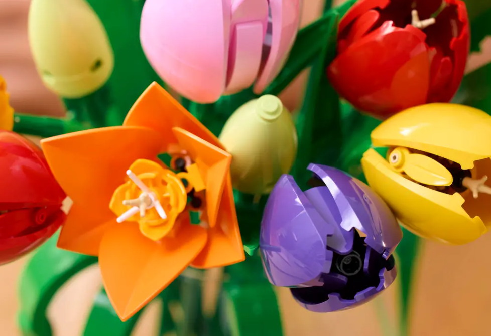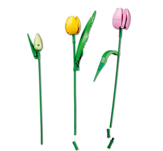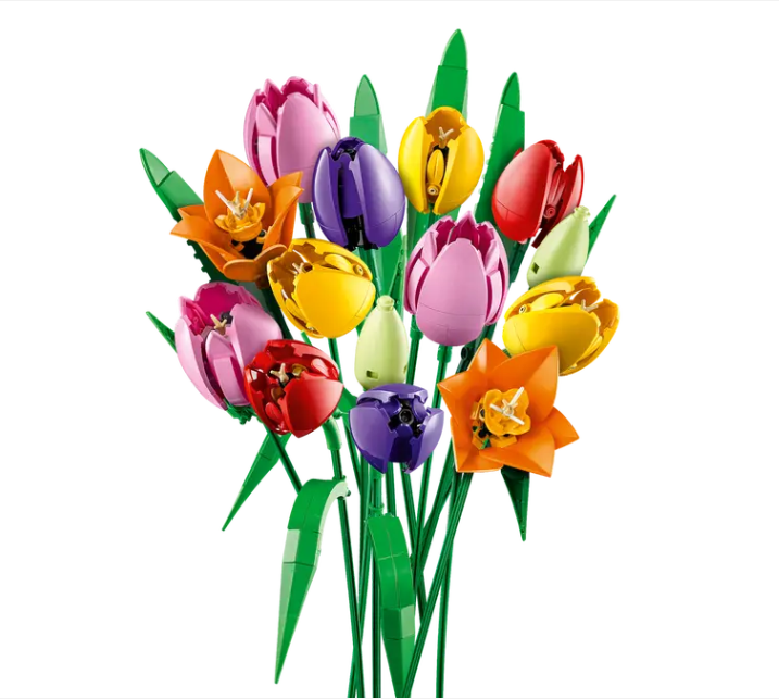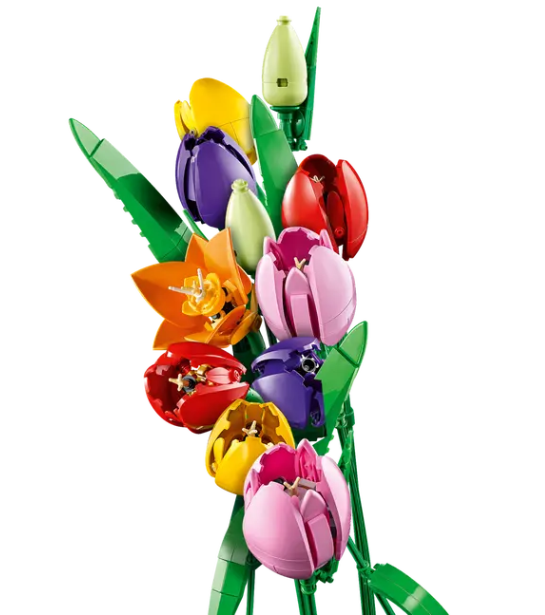 5 LEGO® TULIPS – The bouquet includes 5 varieties of tulips in various colors and stages of bloom; there are green buds, purple closed tulips and red, yellow and pink opened tulips