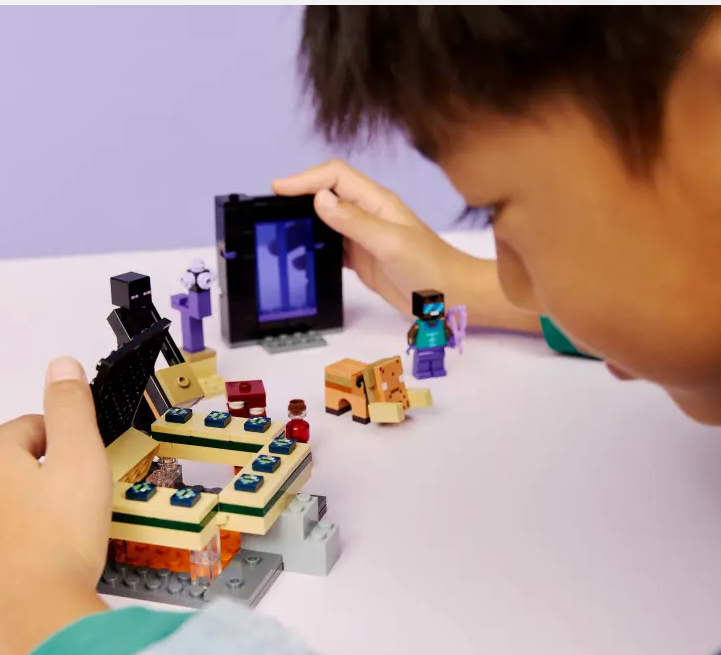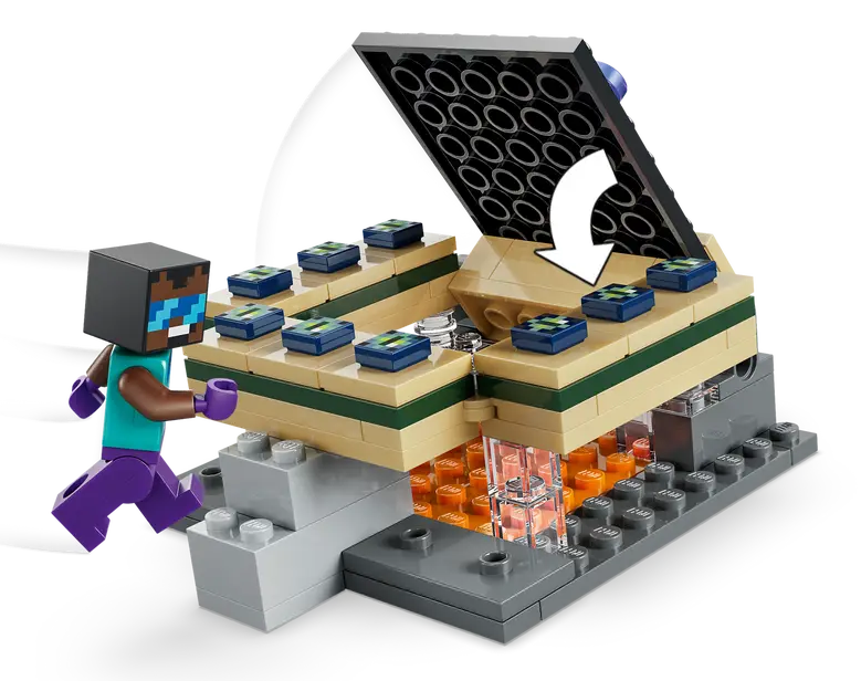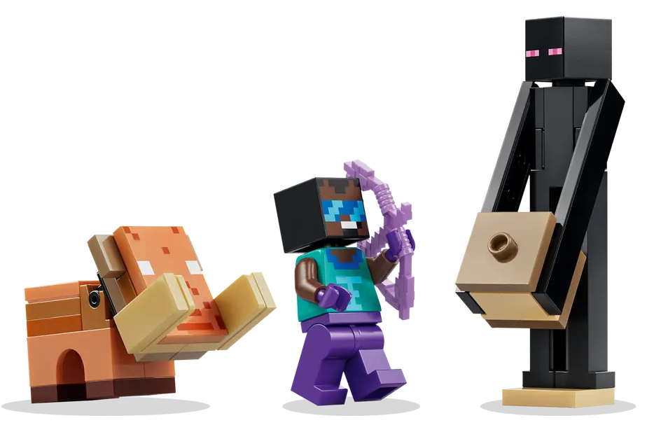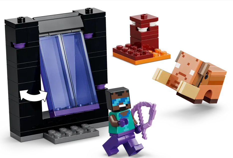 3 CHARACTERS, 2 PORTALS – Activate the toy’s portals and pass through to find a LEGO® build from each biome and Minecraft® action with a Cool Hero minifigure, plus Enderman and a baby hoglin figures