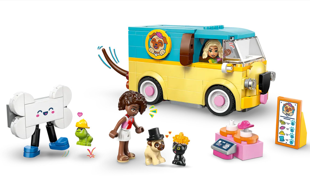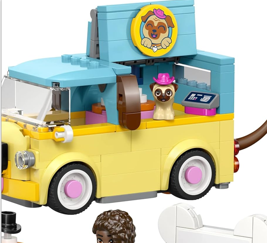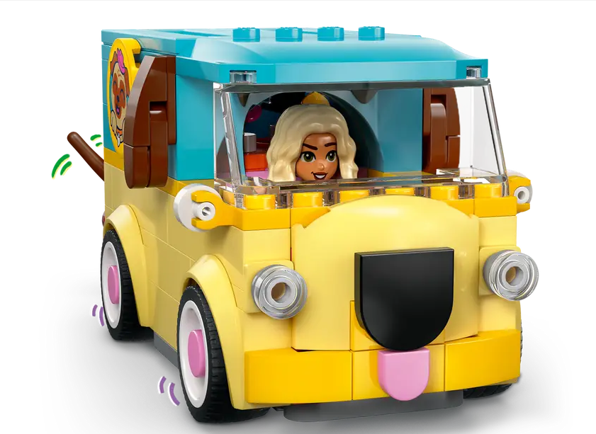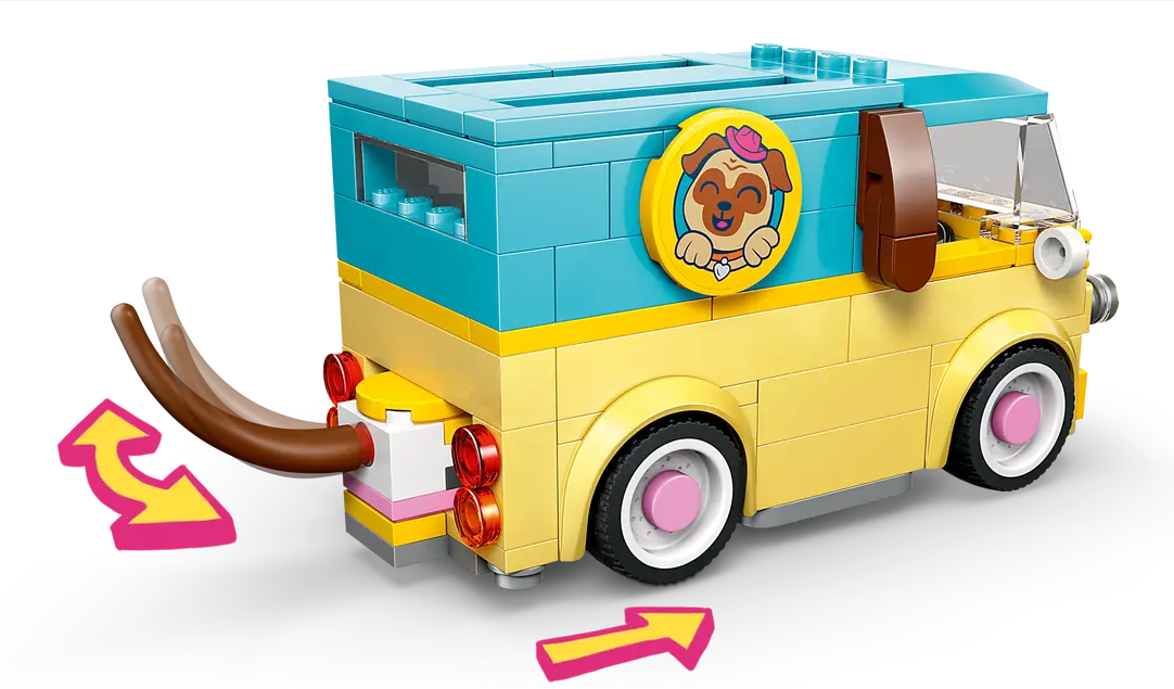 PUG-THEMED VAN – Enjoy tail-wagging deliveries with the adorable LEGO® Friends Pet Accessories Van (42678) featuring a cute pug design, complete with puppy face and a tail that wags as the van moves