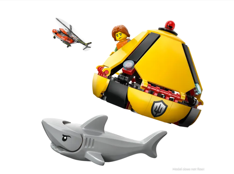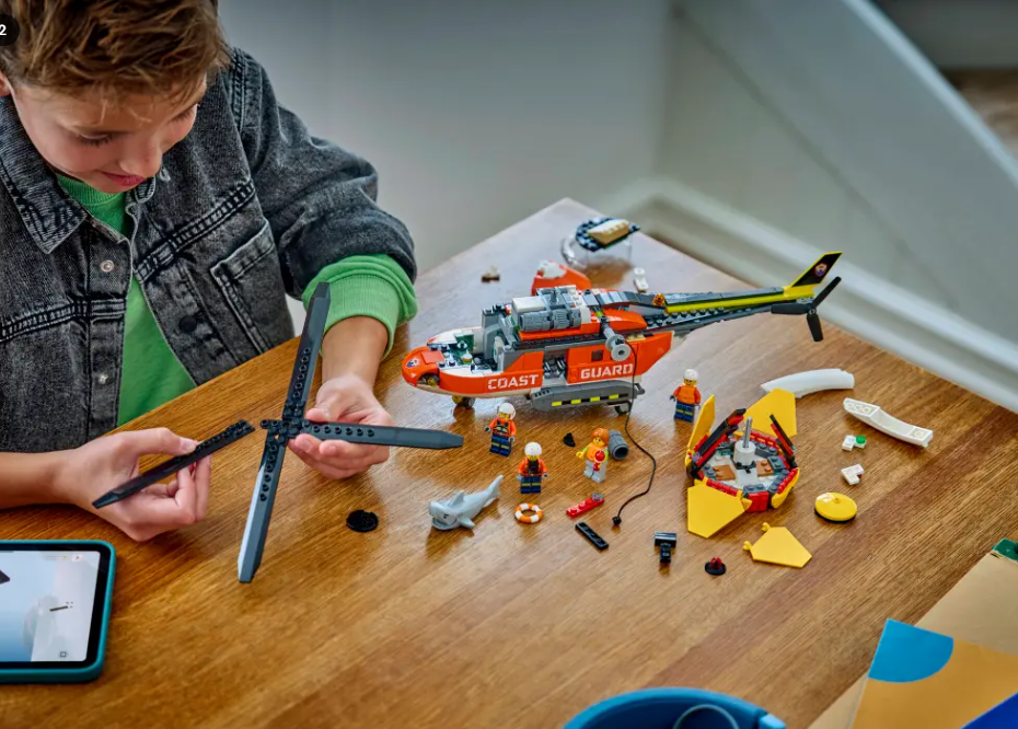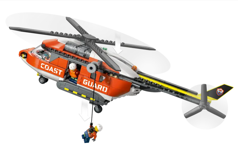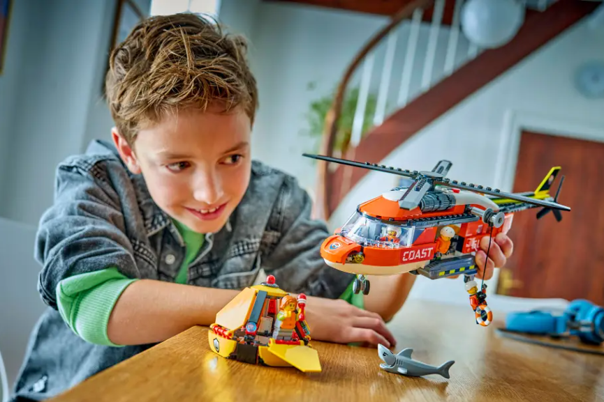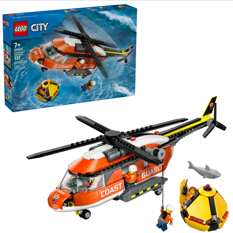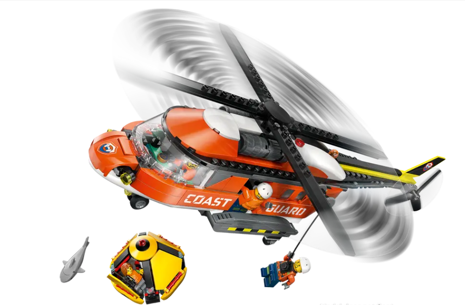 WHAT’S IN THE BOX – Includes everything kids need to build a detailed sea rescue helicopter toy, rescue capsule, plus pilot, civilian and 2 coast guard minifigures and a shark figure