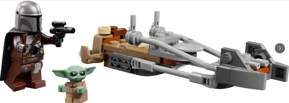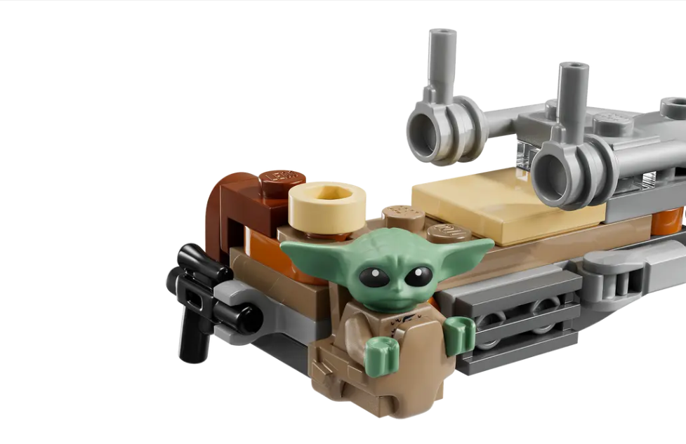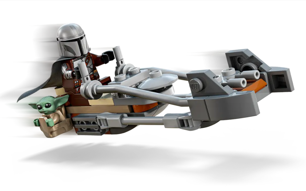 SPEEDER BIKE – Attach The Mandalorian’sblaster rifle to the back of the speeder bike, and place him in the driver’s seat with Grogu alongside in the attached satchel
