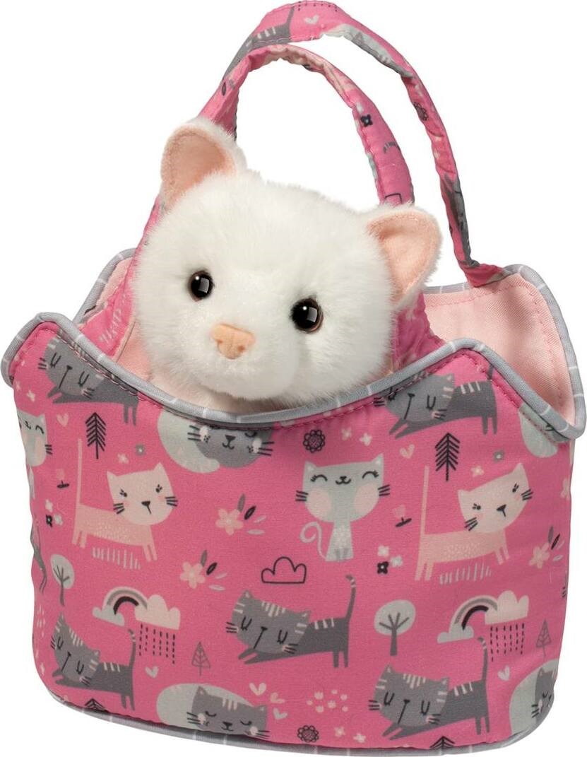 Lovable and soft, a pure white plush kitten stuffed animal sits within the bag with an attentive, warm eyed expression. Her pink ears and nose are sure to win the favor of her new owner and she cannot wait to participate in all the shopping and dress up adventures that lie ahead. An outing with this playful handbag and its cuddly feline companion will make any day that much more special!