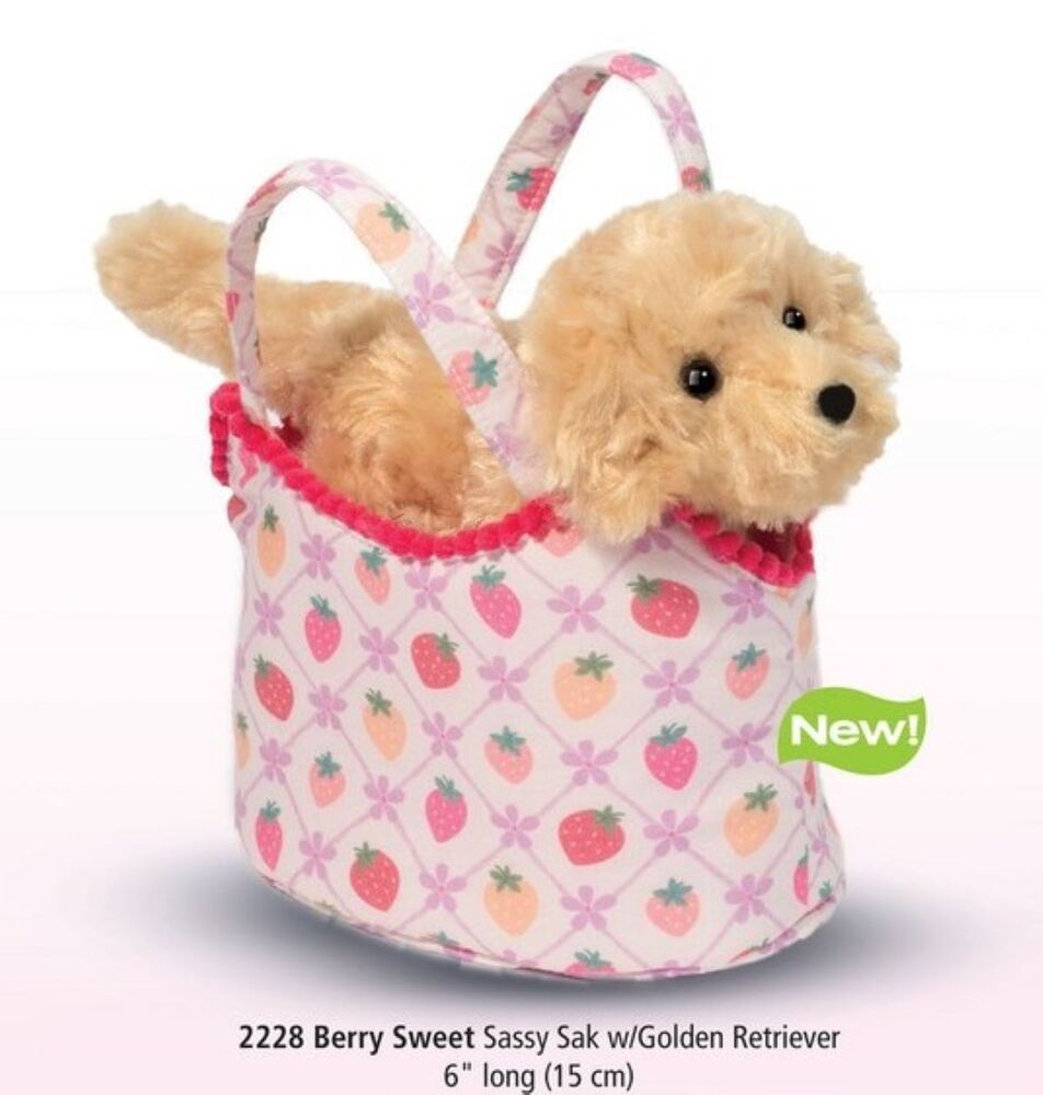 Includes a plush Golden Retriever inside a vibrant Sassy Pet Sak