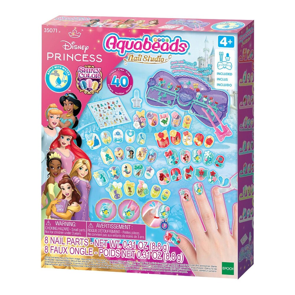 Design sheet includes nail designs featuring Ariel, Belle, Cinderella, Jasmine, Rapunzel, and Tiana, which can be crafted by assembling included Aquabeads nails and decorations with tap water