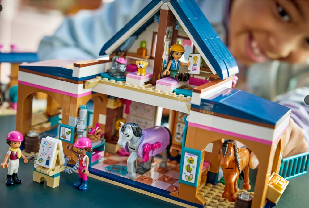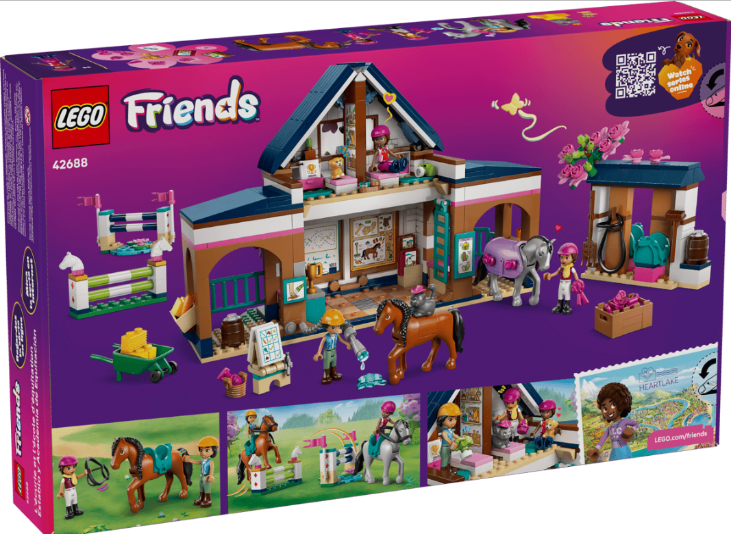 HORSE STABLES PLAYSET – Kids ages 7 and up can gallop into hours of creative play with this detailed LEGO® Friends Horse Stable and Riding Academy (42688), which includes 3 minidolls, 2 horses, puppy