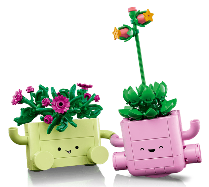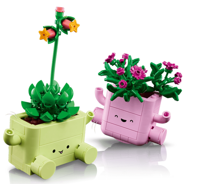 2 LEGO® PLANTS – Craft a delosperma (ice plant) named Lumi with purple buds, an echeveria named Ellie with a tall stem and coral buds, plus 2 plant pots with arms, legs and smiley faces