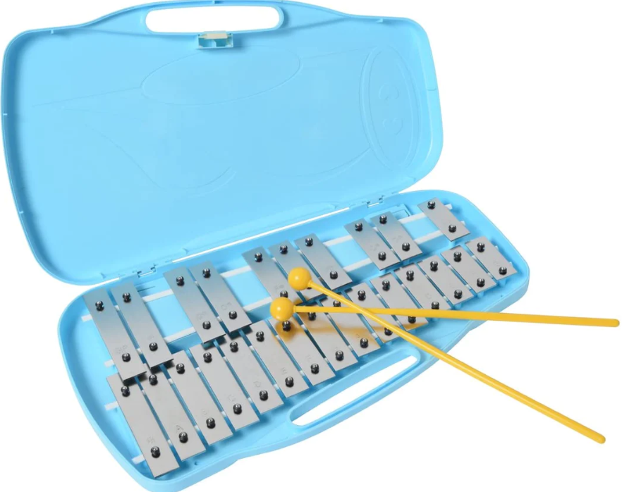 A quality 25-note Glockenspiel with silver plated sound blocks, encased in a sky-blue plastic carrier case, making this portable instrument ideal for home use and use in schools. Equipped with silicon buffers for a rich, full tone and legs to open resounding holes on the bottom. Comes with 2 soft plastic mallets.