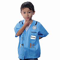 The doctor will see you now. This easy on shirt, made to look like doctor's scrubs, will make a preschooler ready to check his patients. Blue fabric printed with stethoscope, tongue depressor, syringe and other important tools of the trade. [more info...]